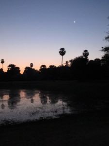 Sun rising but the Moon Still out over Angkor Wat